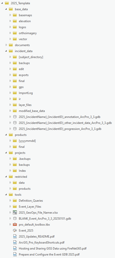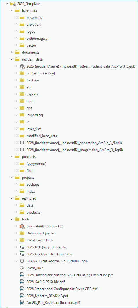 There is a required directory structure minimum for GIS data and related documents created and used on incidents managed under the Incident Command System (ICS). The standard directory structure is clear and repeatable; it promotes efficient use and storage of GIS data and ensures a smooth transition between GIS Specialists (GISS) by making it easy to locate data or products. This structure may be used both by incident GIS Specialists and by GIS professionals at the home unit of the incident. The intention is to allow some scalability for variation of incident situation, such as in number of GISS​ personnel, hardware use/availability, software used, available data, and even physical location, while still meeting the needs of those with whom the GISS cooperates.